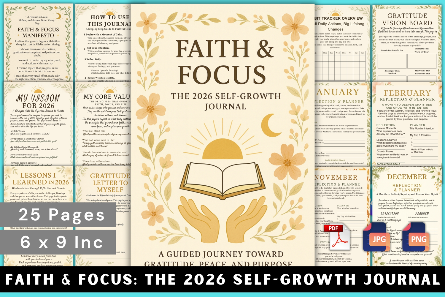 Find balance, gratitude, and purpose with Faith & Focus: The 2026 Self-Growth Journal — a guided printable designed to help you align your spiritual, emotional, and growth goals throughout the year. This beautifully structured journal offers monthly reflections, goal-setting pages, and gratitude prompts to help you walk through 2026 with mindfulness and faith.