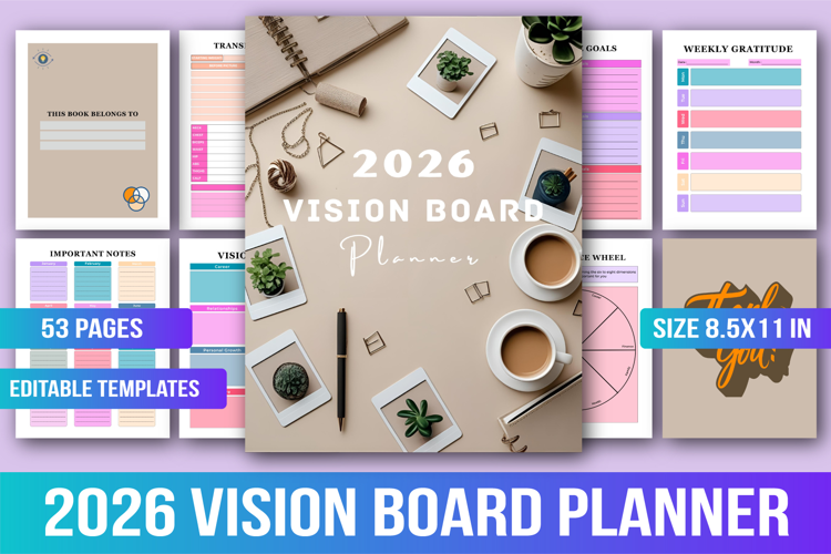 The 2026 Vision Board Planner is your all-in-one printable toolkit for manifesting your goals and creating a balanced, purpose-driven year. Packed with beautifully designed pages—from vision mapping and gratitude tracking to goal setting and health logs—this planner helps you visualize, track, and achieve your dreams with ease.