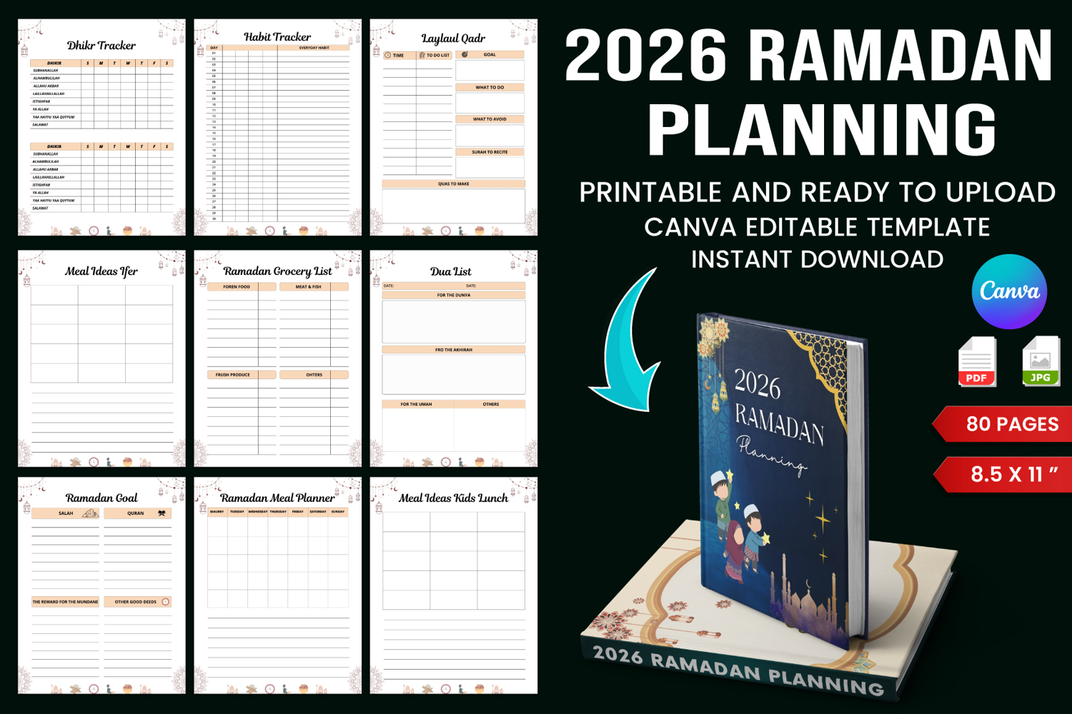 This 2026 Ramadan Planning Planner is a complete spiritual and lifestyle organizer designed to help you make the most of the blessed month of Ramadan. From daily fasting reflections to Qur’an tracking, dua lists, meal planning, charity planning, and Eid preparation—this planner supports your spiritual growth, discipline, and daily organization throughout Ramadan and beyond.