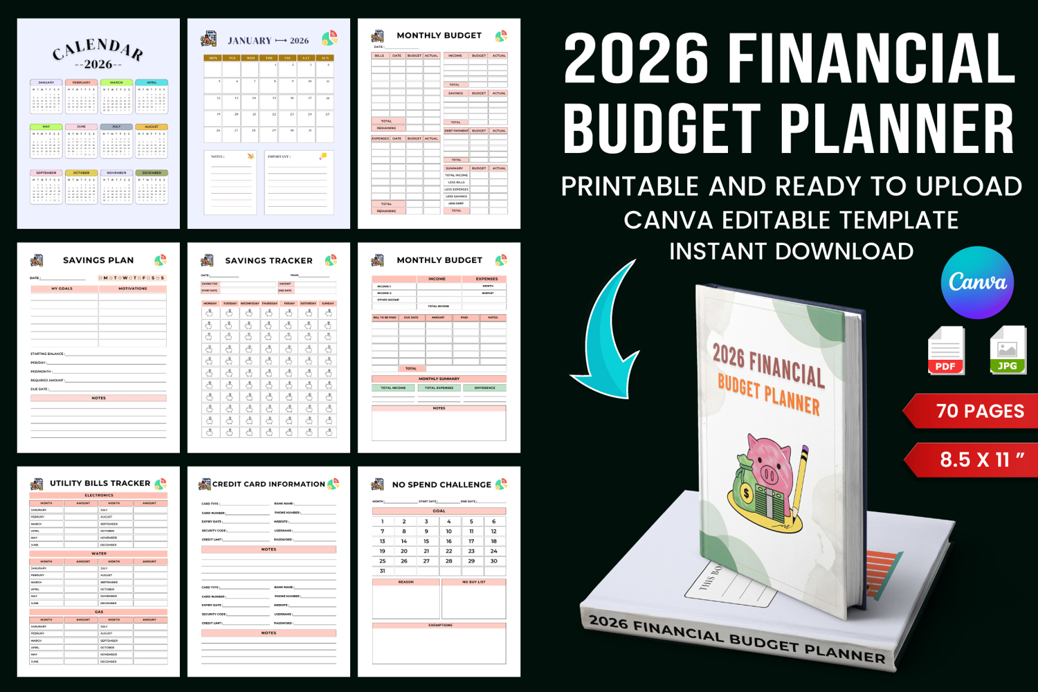 Take full control of your finances in 2026 with this all-in-one Financial Budget Planner. Designed to help you plan, track, and optimize your money throughout the year, this planner covers everything from daily expenses and monthly budgets to savings challenges, debt payoff, and long-term financial goals. Whether you’re managing finances, household budgets, or financial goals, this planner keeps everything organized in one place.