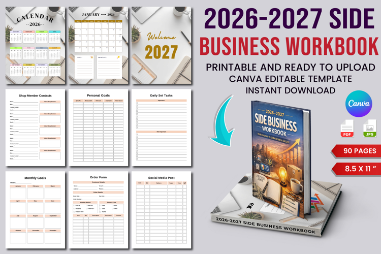 The 2026–2027 Side Business Workbook Planner is a complete productivity and business management tool designed to help entrepreneurs plan, organize, and grow their side hustle efficiently. It combines calendar planning, goal setting, financial tracking, and business strategy into one structured system—making it easier to stay focused and achieve consistent progress.