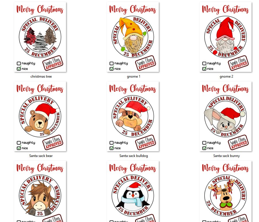Collection of 12 sublimation designs for Santa Sacks.