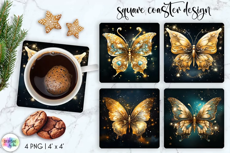 Butterfly Coasters Sublimation | Golden Christmas Butterfly example image 1