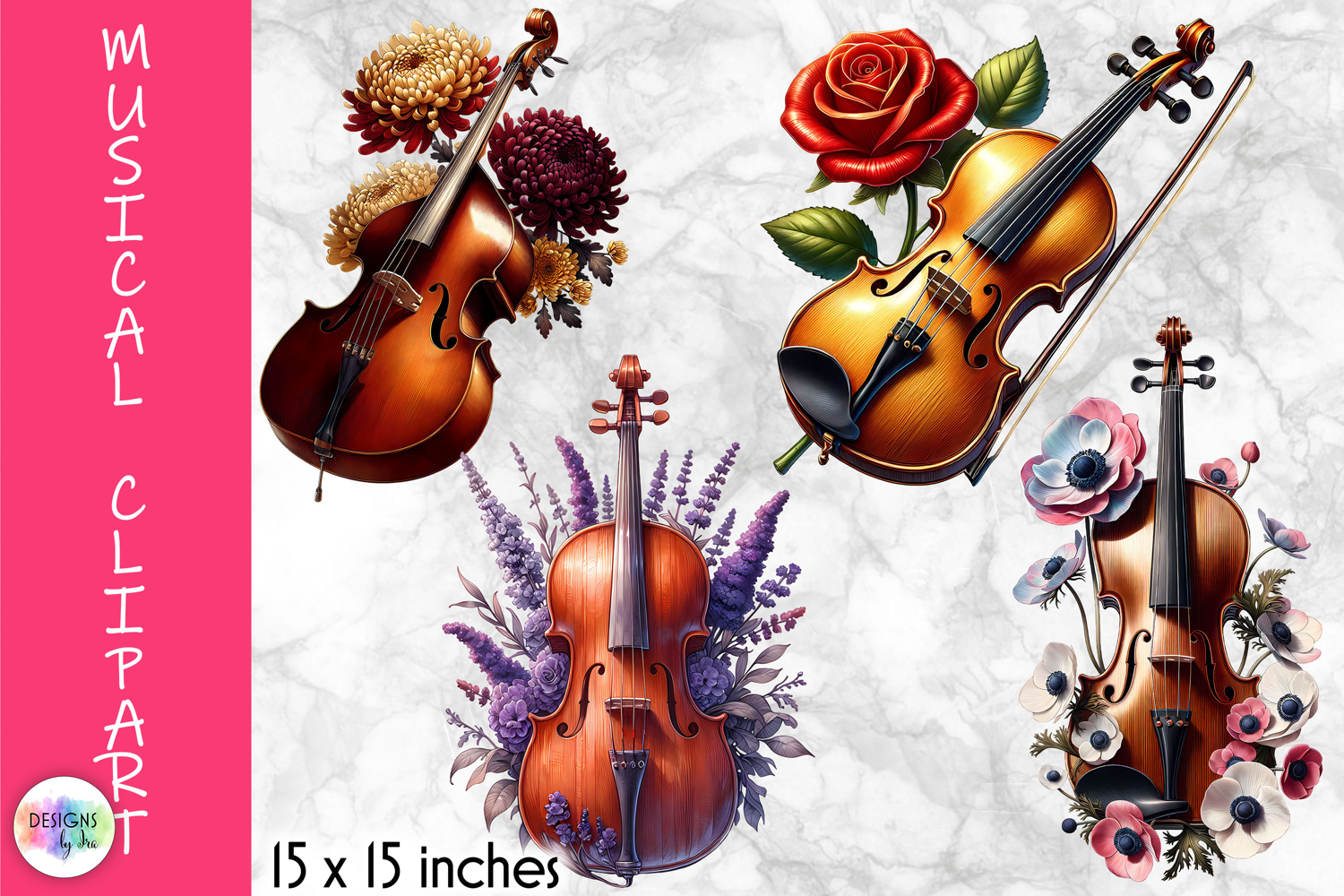Musical instrument PNG clipart featuring violin, piano, saxophone, clarinet, drums, and more with floral decorations. High-resolution PNGs with transparent backgrounds, perfect for sublimation, music crafts, posters, and creative projects.