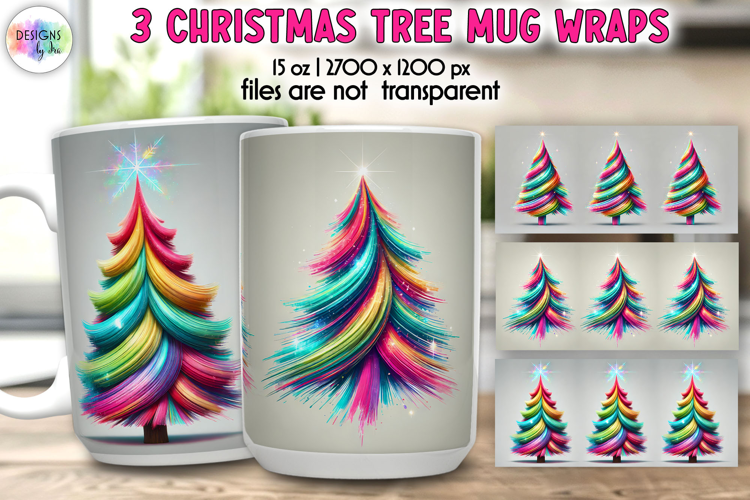 Includes 3 high-quality 15 oz mug designs (2700x1200 px) featuring modern abstract Christmas trees. Perfect for sublimation printing on mugs, tumblers, or holiday gifts.