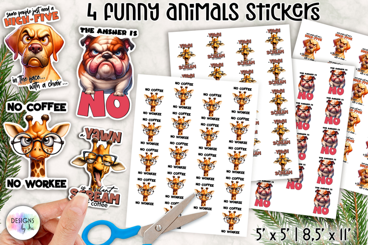 This pack includes 4 cute animal sticker designs featuring expressive giraffes and dogs and witty sarcastic coffee quotes.