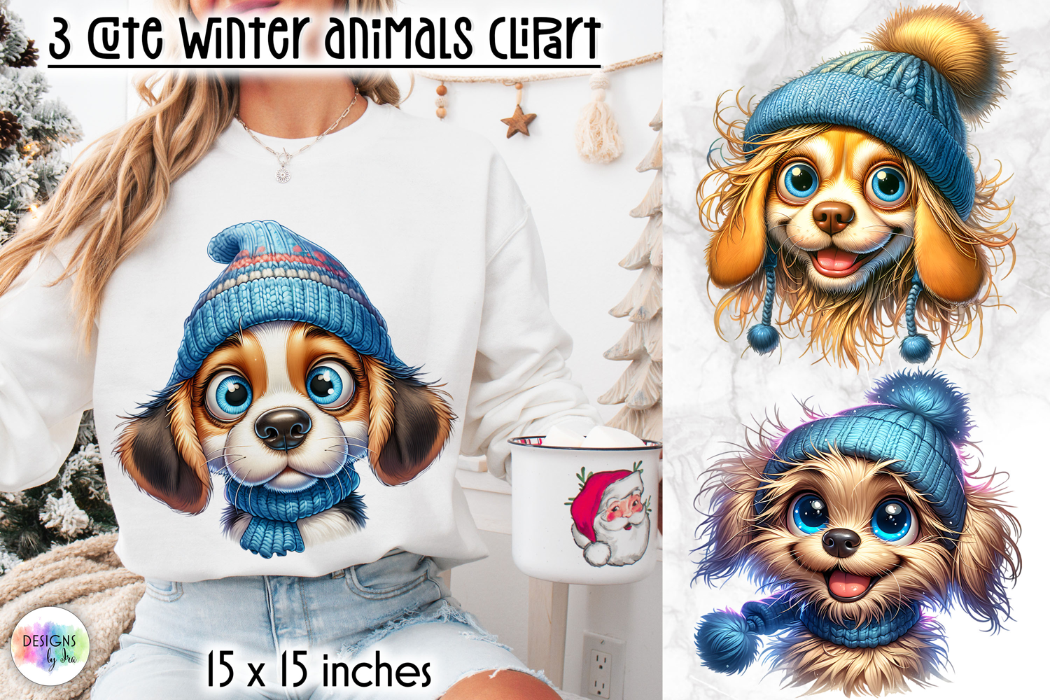 Includes 3 high-quality PNG files (15” x 15”, 300 DPI) featuring adorable baby animals wearing cozy blue winter hats.