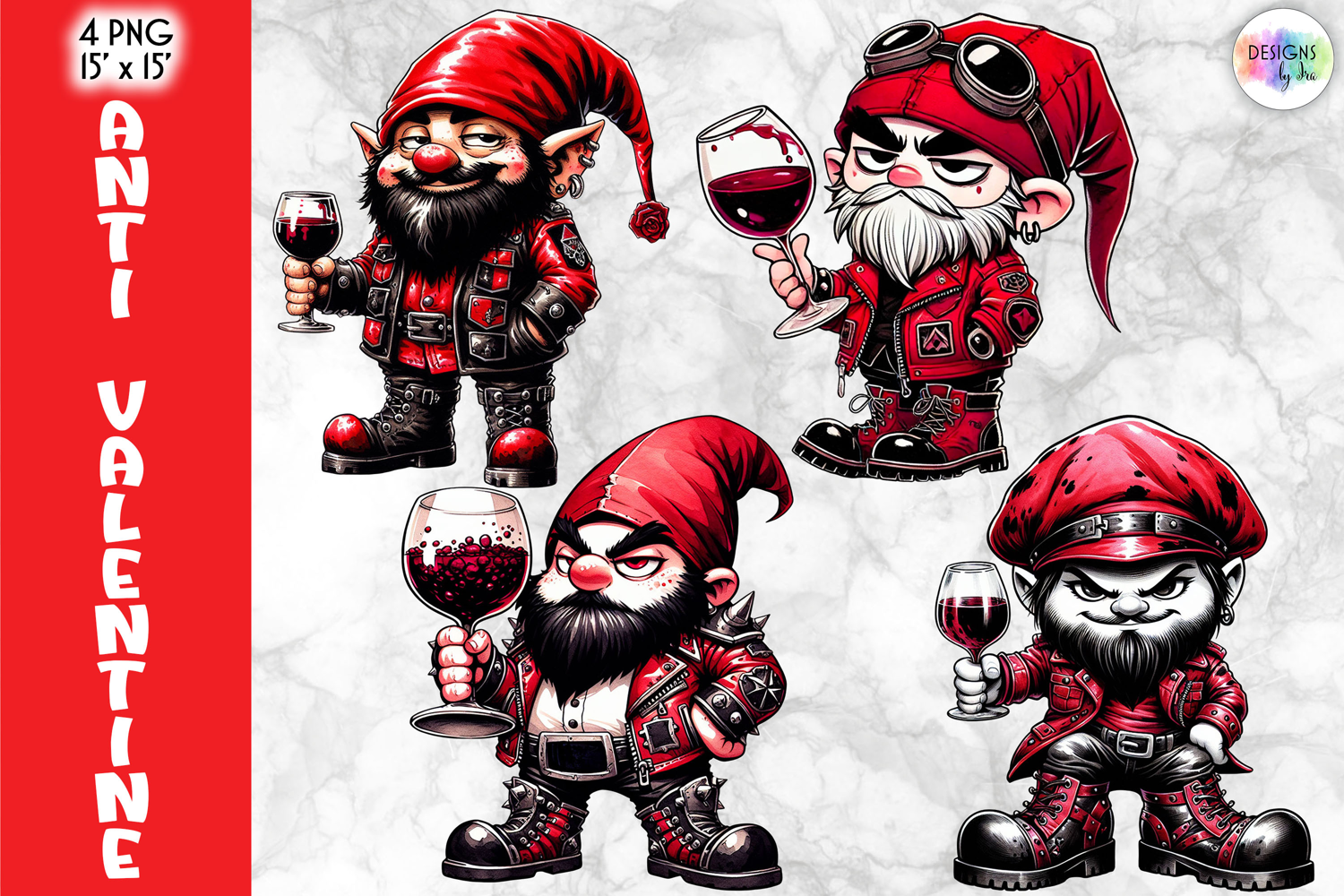 This Anti-Valentine Gnomes Clipart features a bold collection of cute-but-rebellious gnome characters with a rock, gothic, and slightly sarcastic Valentine vibe. Dressed in red leather jackets, combat boots, beanies, and punk accessories, these gnomes mix sweetness with attitude — perfect for anti-love designs, alternative Valentine projects, and edgy gift creations.