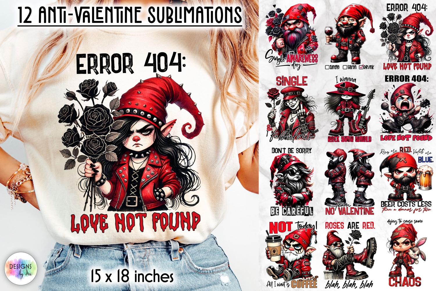 Each design combines edgy gnome characters, red-and-black gothic aesthetics, and witty sayings like “Error 404: Love Not Found”, making this bundle ideal for t-shirts, sweatshirts, tote bags, pillows, mugs, and other sublimation projects.