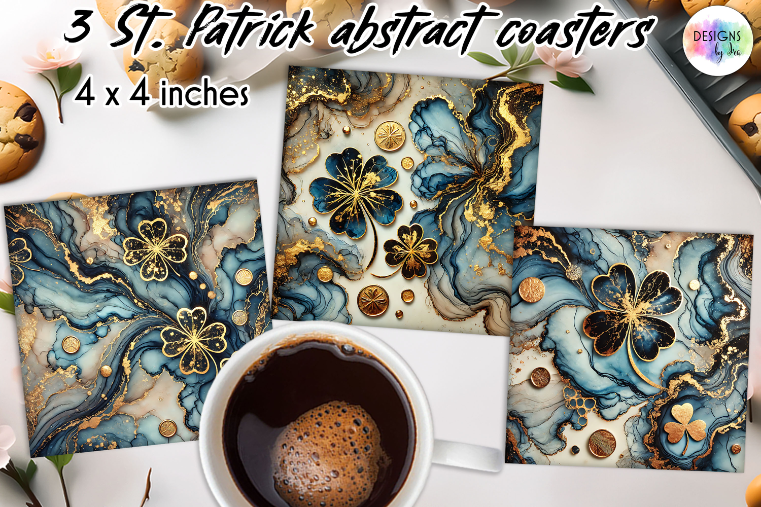This collection features three St. Patrick’s Day–inspired abstract coaster designs created in a rich alcohol ink style. Flowing marble textures blend emerald green, teal, blue, pink, and gold tones, accented with elegant shamrock motifs, golden details, and coin-inspired elements.