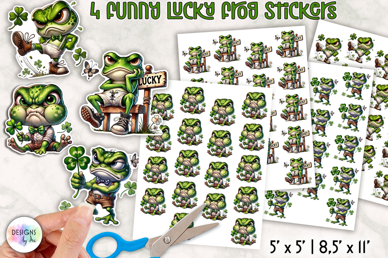 The illustrations are bold, colorful, and full of character, designed in a whimsical cartoon style that stands out on stickers, planners, scrapbooks, party decorations, and seasonal crafts. Each frog has a unique pose and attitude, making the designs lively and eye-catching.