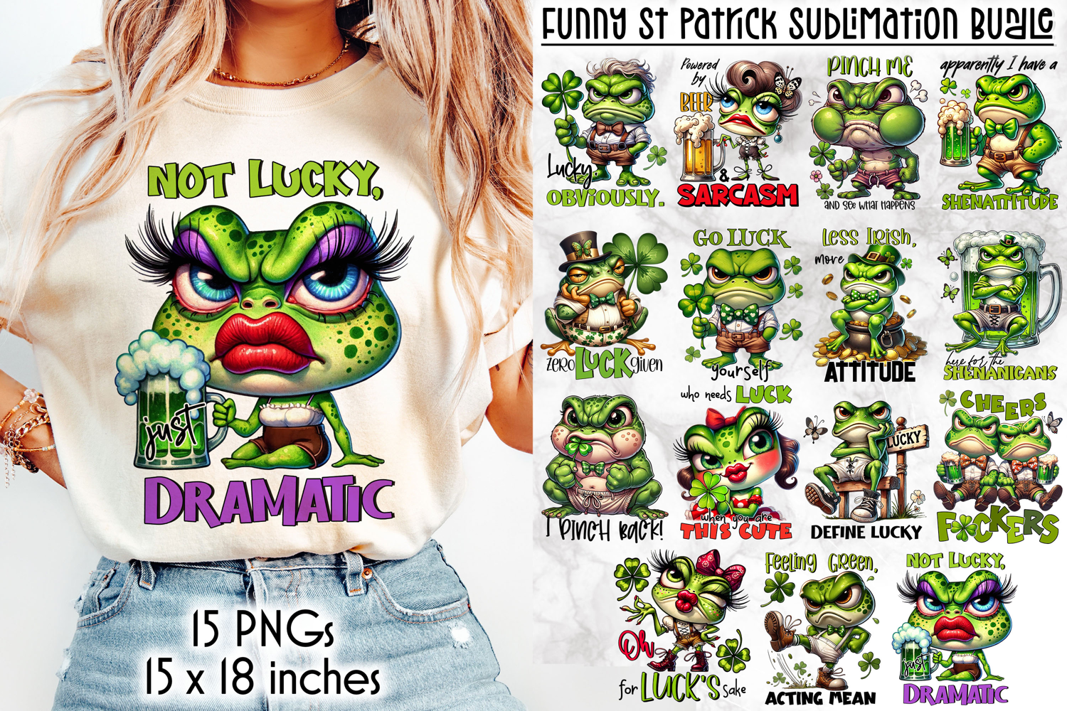 A hilarious collection of St Patrick–themed sublimation designs featuring sassy cartoon frogs, shamrocks, beer mugs, and bold sarcastic quotes. These vibrant green designs are packed with attitude and humor, making them perfect for festive apparel, mugs, tote bags, signs, and party decor.