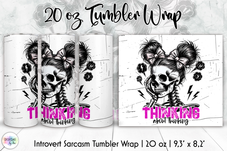Trendy sarcastic 20oz skinny tumbler wrap featuring a detailed skeleton girl with bow hairstyle and bold pink typography “Thinking About Thinking”. Perfect for introverts, overthinkers and sarcastic gift lovers.