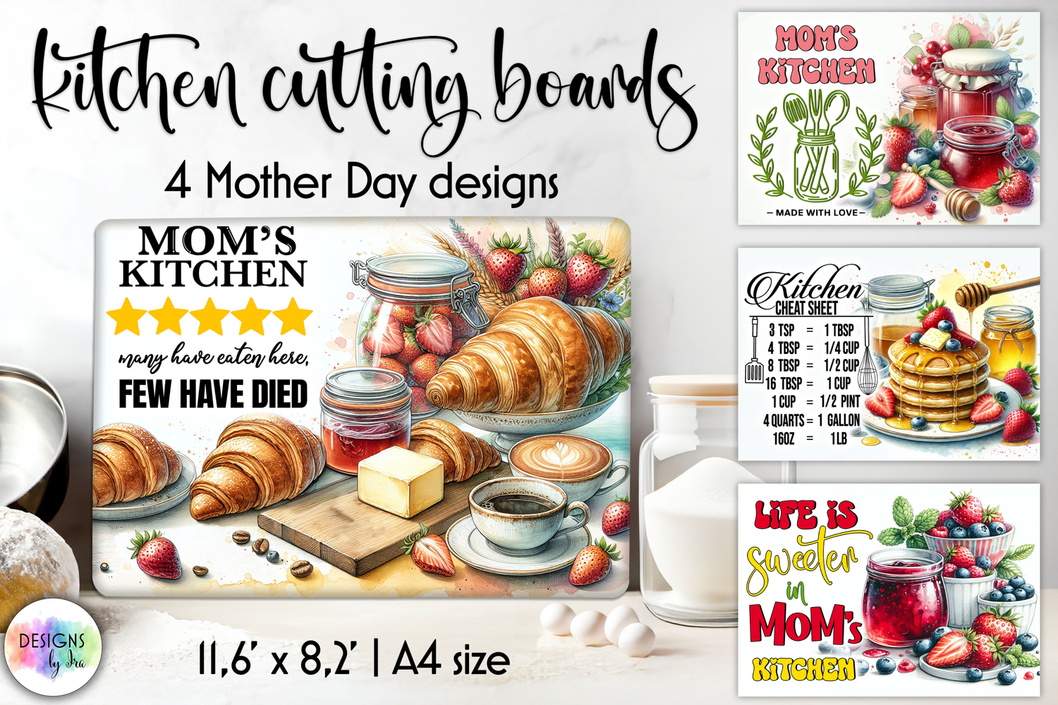 A charming collection of kitchen-themed cutting board designs celebrating the warmth of homemade cooking and a mother’s love. These cozy illustrations feature delicious meals, fresh vegetables, baked bread, pasta, desserts, herbs, and cooking utensils paired with heartwarming phrases like “Mom’s Kitchen,” “Made with Love by Mom,” and other family-inspired kitchen sayings.