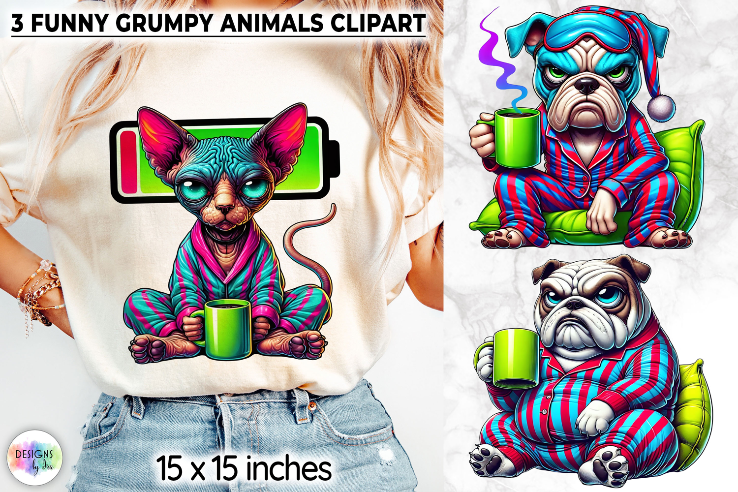 A playful collection of funny grumpy animal clipart featuring expressive cartoon characters in cozy hoodies and pajamas holding coffee mugs. These humorous illustrations capture the classic “not a morning person” mood with bold colors, exaggerated expressions, and quirky personality.