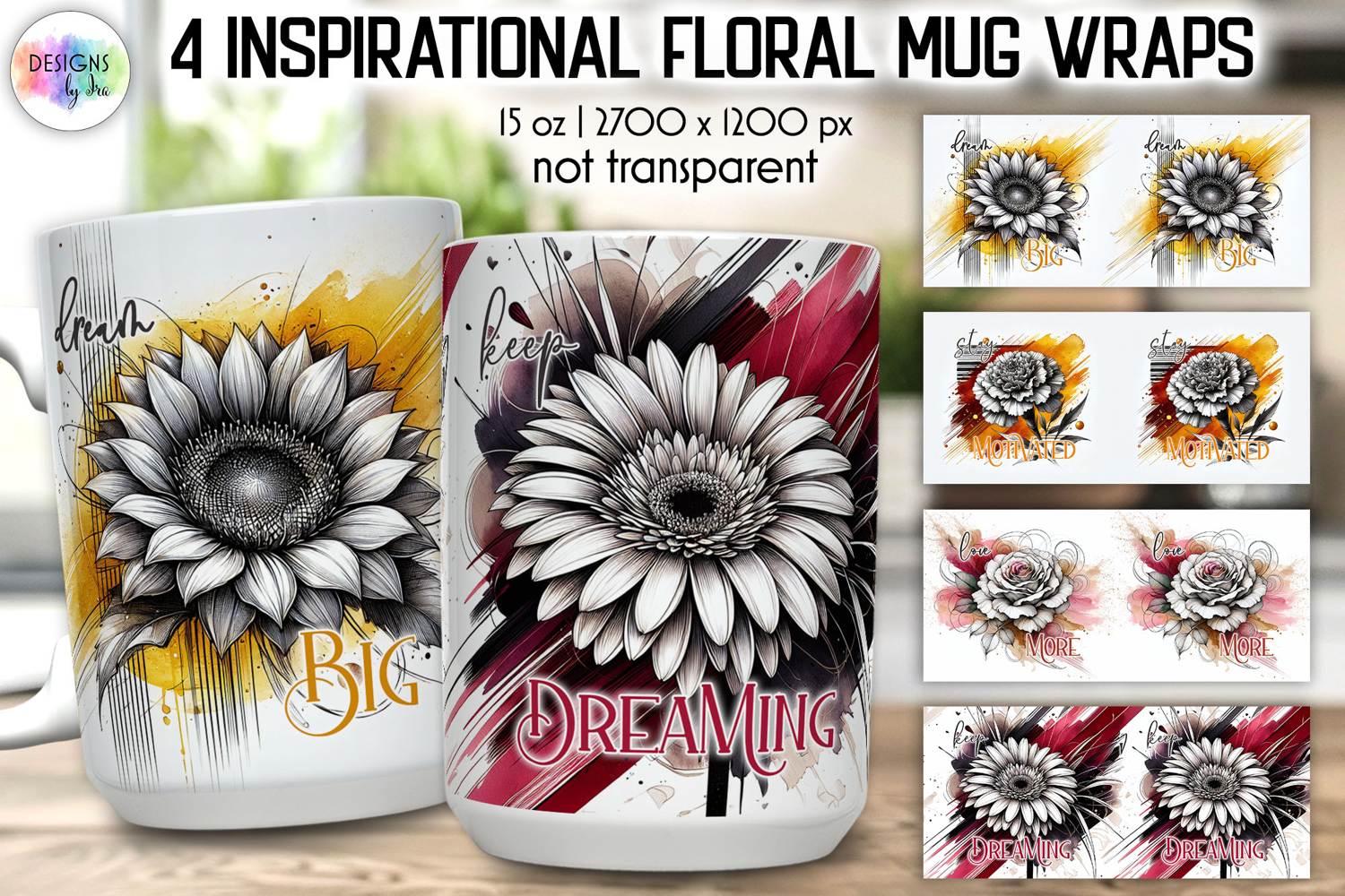 A bold collection of 4 inspirational floral mug wraps featuring detailed monochrome flowers paired with vibrant watercolor splashes and expressive typography.