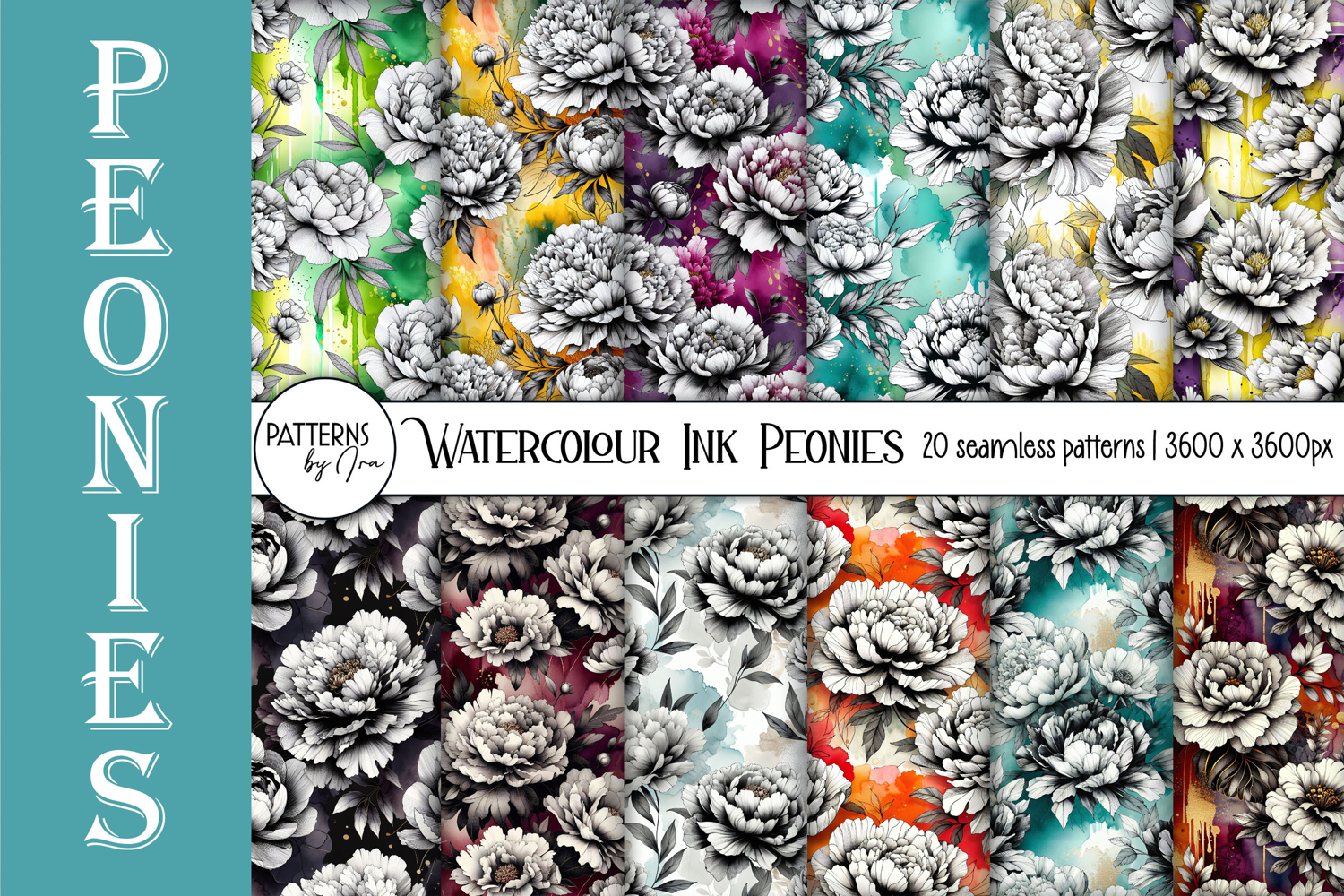Watercolour and Ink Peonies Seamless Pattern Bundle