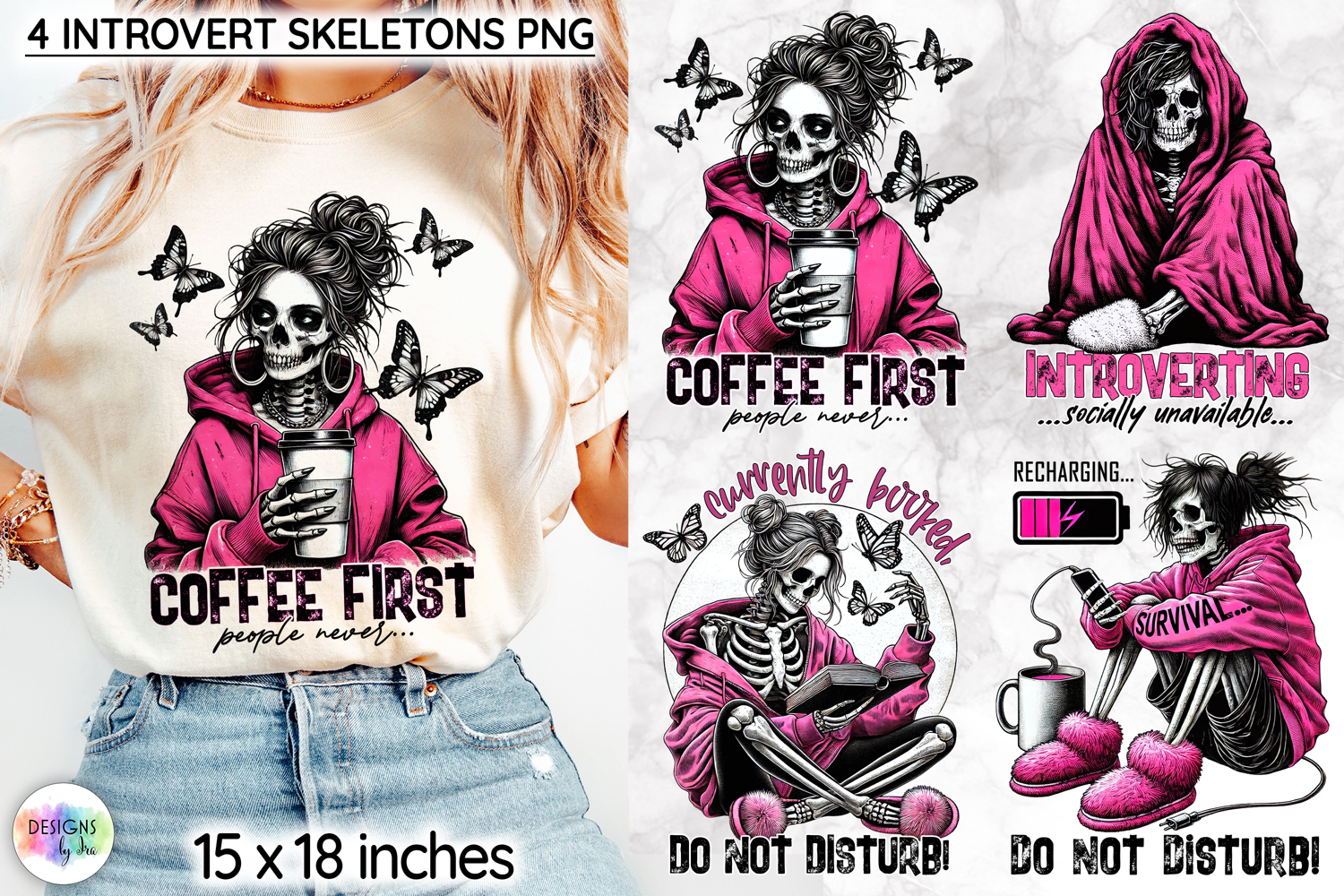 Stylish and edgy skeleton character designs featuring witty introvert quotes and bold pink accents. Perfect for creating standout t-shirts, hoodies, mugs, and other sublimation products with a modern gothic and sarcastic vibe.