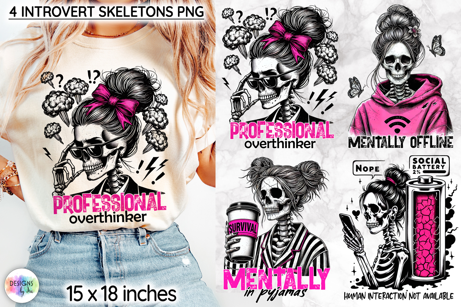 Stylish and edgy skeleton character designs featuring witty introvert quotes and bold pink accents. Perfect for creating standout t-shirts, hoodies, mugs, and other sublimation products with a modern gothic and sarcastic vibe.