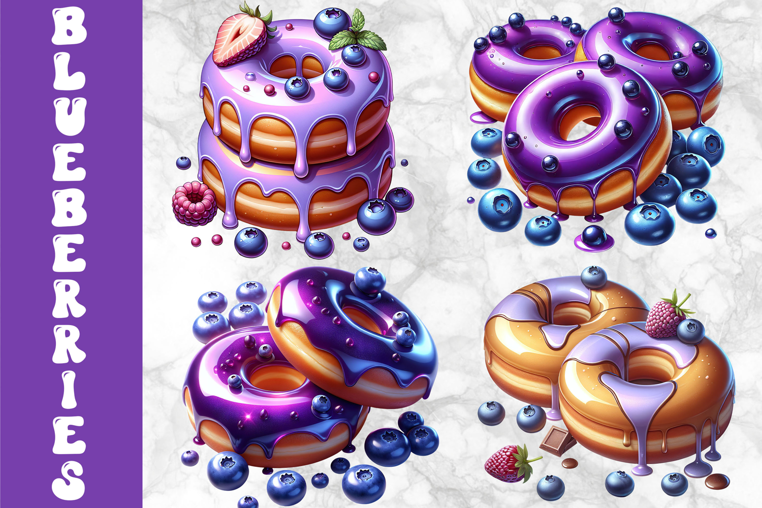 A cohesive collection of blueberry-themed dessert illustrations featuring glossy donuts, cakes, pastries, breakfast dishes, and refreshing drinks. Designed in a clean, vibrant style with rich berry tones and smooth gradients, these graphics are perfect for sublimation, t-shirt prints, mugs, stickers, kitchen decor, and digital design projects. Ideal for bakery themes, food lovers, and summer-inspired creations.