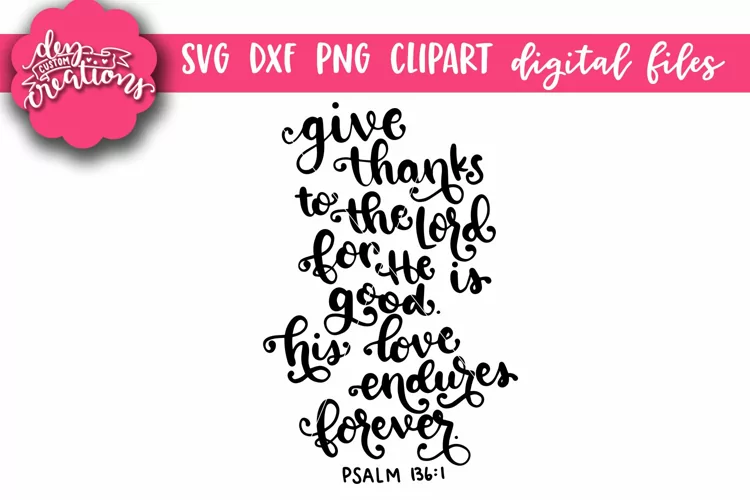 "Give thanks to the Lord for he is good. His love endures forever. Psalm 136:1" Handlettered SVG - DXF - PNG - Cut Files