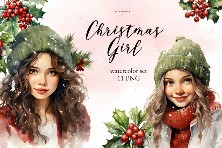 Watercolor Christmas Girl| PNG Clipart bundle