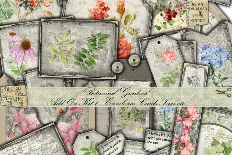 Beautifully designed Vintage Shabby Grunge Style Botanical Junk Journal Ephemera Kit to go with the Botanical Junk Journal Pages kit. The back grounds were created from scratch and are decorated with a variety of Botanical images to create unique and one of a kind Ephemera Pieces. Gorgeous Printable, Junk Journal, Vintage, Ephemera Pack, Journal Ephemera, Envelopes, Journaling Cards, Tags, Inspirational Quotes, Digital Collage, Collage Sheet, Embellishments, Scrapbooking, Digital Download, Vintage Grunge. Ephemera for your junk journal, scrapbooking, stationery, card making, mixed media and all paper art and craft projects. This kit looks great just coffee stained and left as is or decorated with details such as lace/buttons/flowers/staples etc. Instant Download and print.
