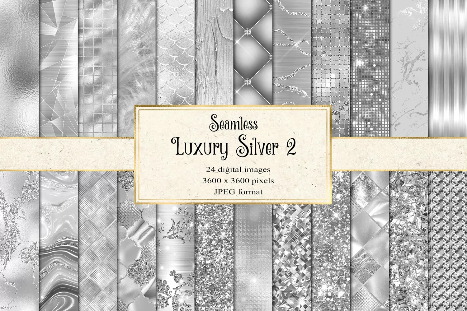 Ultra glam! This is a set of 24 seamless luxury silver textures with foils, sequins, marble, paint, and glitter. Each image measures 12 x 12 inches (30.5 x 30.5 cm) and has 300 dpi resolution. These textures are perfect for digital art prints, web design, wedding props, invitations, and so much more!