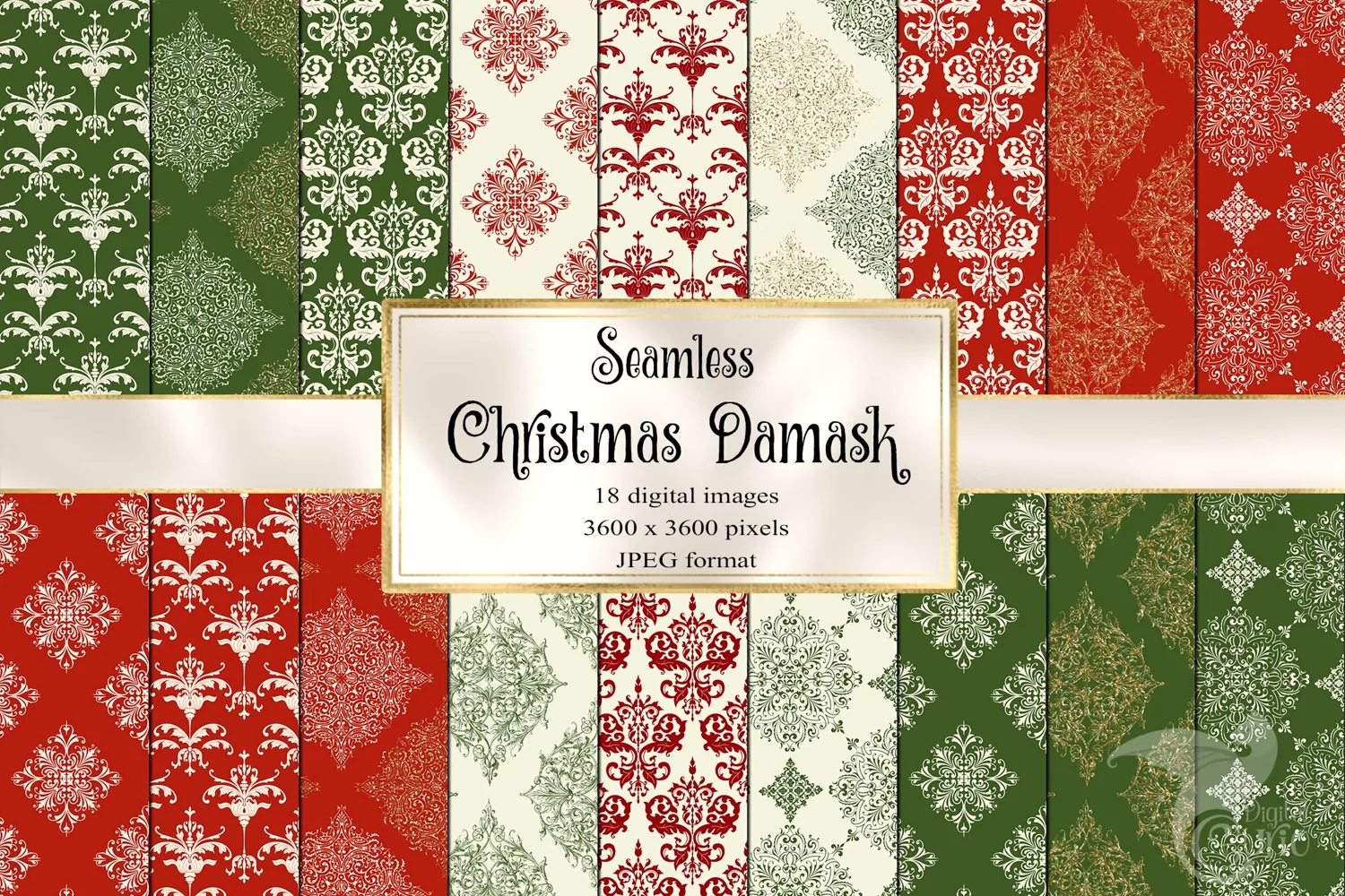 This is a set of 18 festive digital papers, each with an ornate and unique damask pattern. Each image measures 12 x 12 inches (30.5 x 30.5 cm) and has 300 dpi resolution. These are in seamless format, making them ideal for large prints, fabrics or web backgrounds.