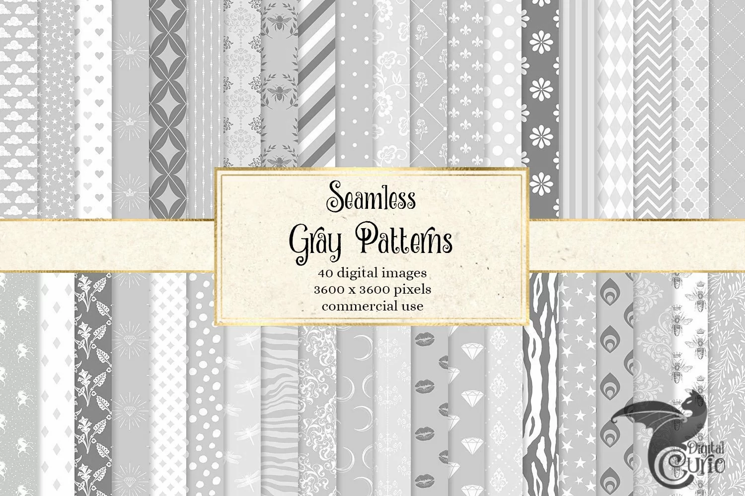This pack of 40 high quality light gray digital papers is perfect for baby showers, scrapbooking, or any printable or digital creative project. Patterns include classic patterns such as stars, stripes, hearts, chevron, polka dots, and more! Each image measures 12 x 12 inches (30.48 cm) and has 300 dpi resolution. Their seamless format makes them easily tileable for large prints, fabrics or web backgrounds.