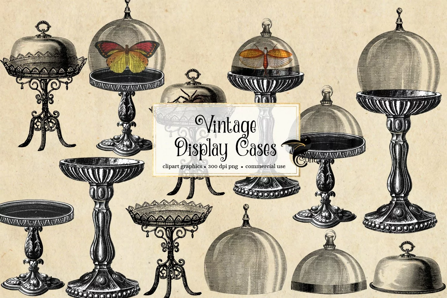 I needed some of these but it seems to be difficult to find vintage display case images. So I made these from a hodgepodge of other antique illustrations - pieces of candlesticks, light bulbs, and dishes. This set includes assembled cases and also has stands separate from the glass tops so you can make your own. They are in PNG format with transparent backgrounds, at 300 dpi resolution.