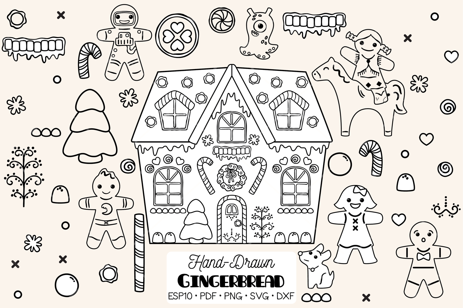 A set of hand-drawn gingerbread house, boy & girl cookies.