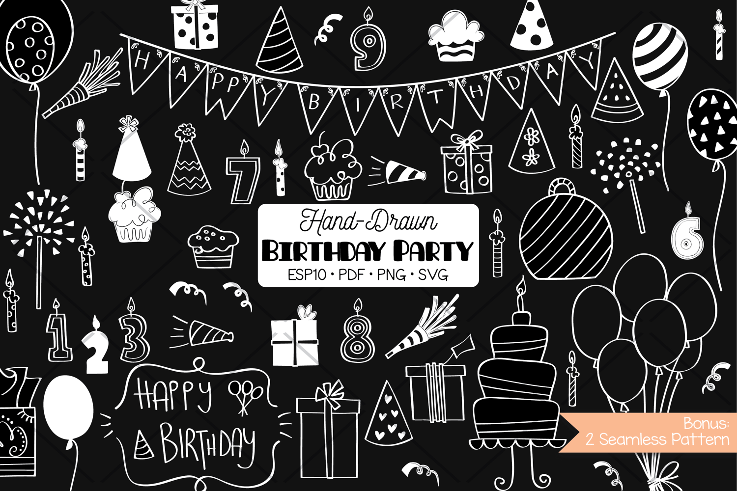 A set of hand-drawn birthday party items; balloons, cakes, gifts, number candles, banners.