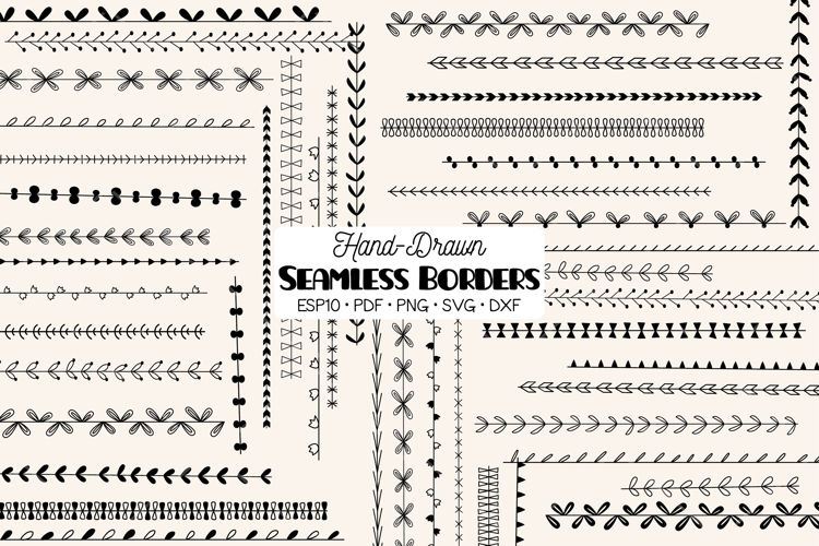 A set of hand-drawn seamless borders; floral, leaves, bow, arrows, frame, line, abstract, geometric.