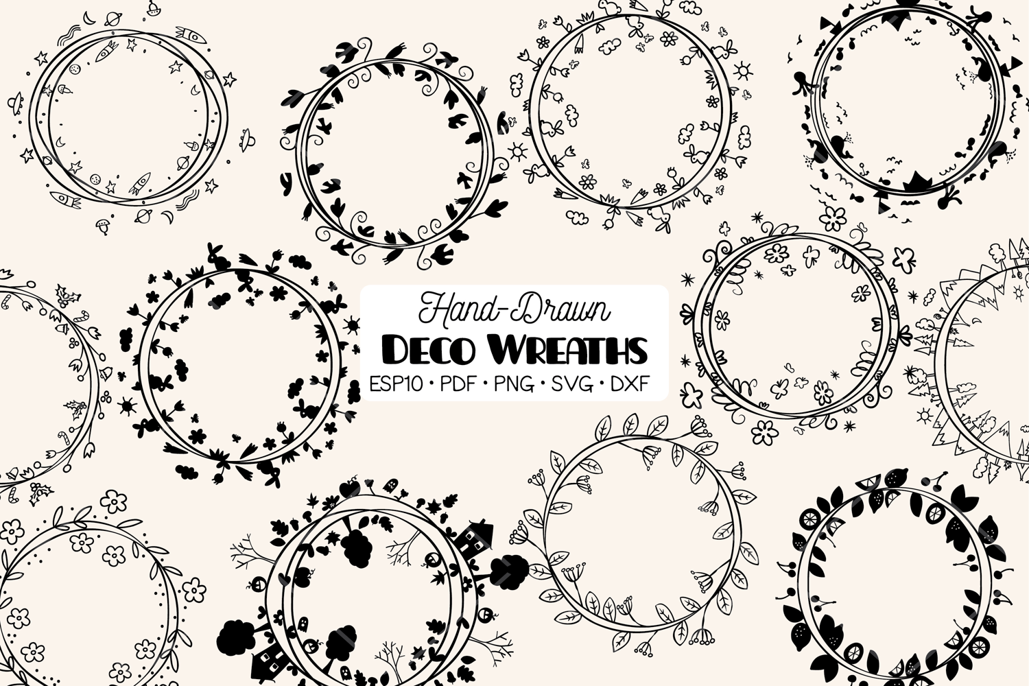 Hand drawn 12 decorative calendar wreaths drawings, monthly and blank.