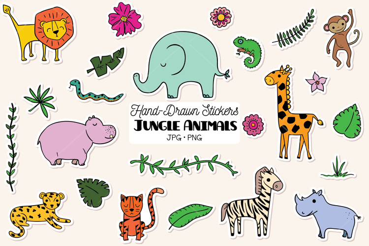Jungle Animals Printable-Digital Stickers; lion, tiger, elephant, monkey, zebra, hippo.