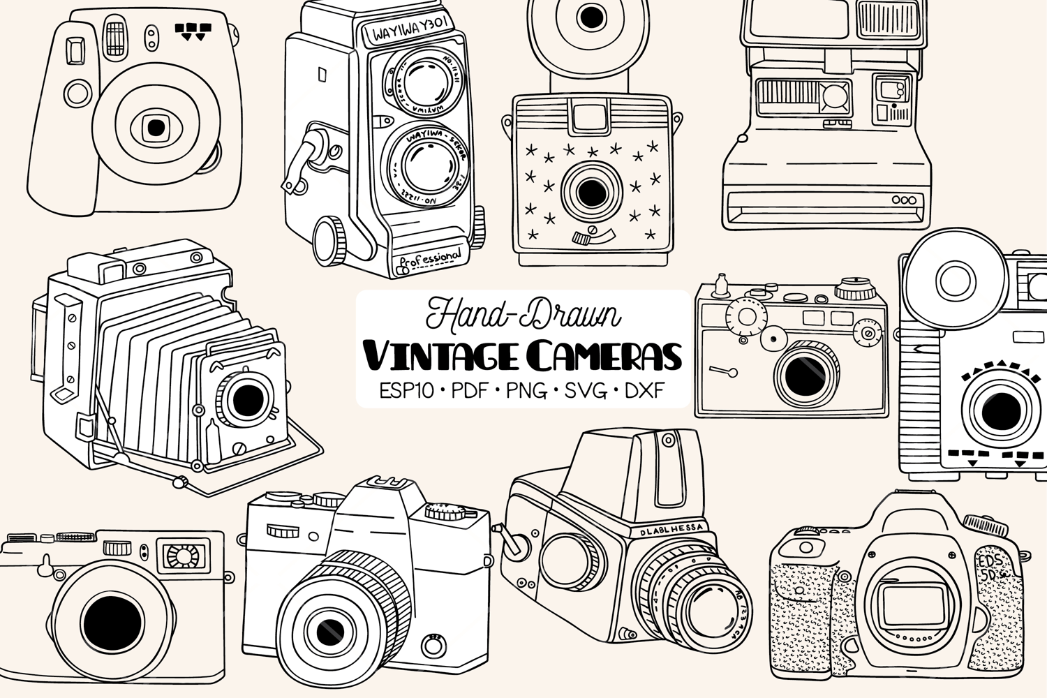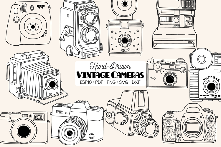 A set of hand-drawn vintage cameras, Polaroid, Kodak, Canon, retro video camera.