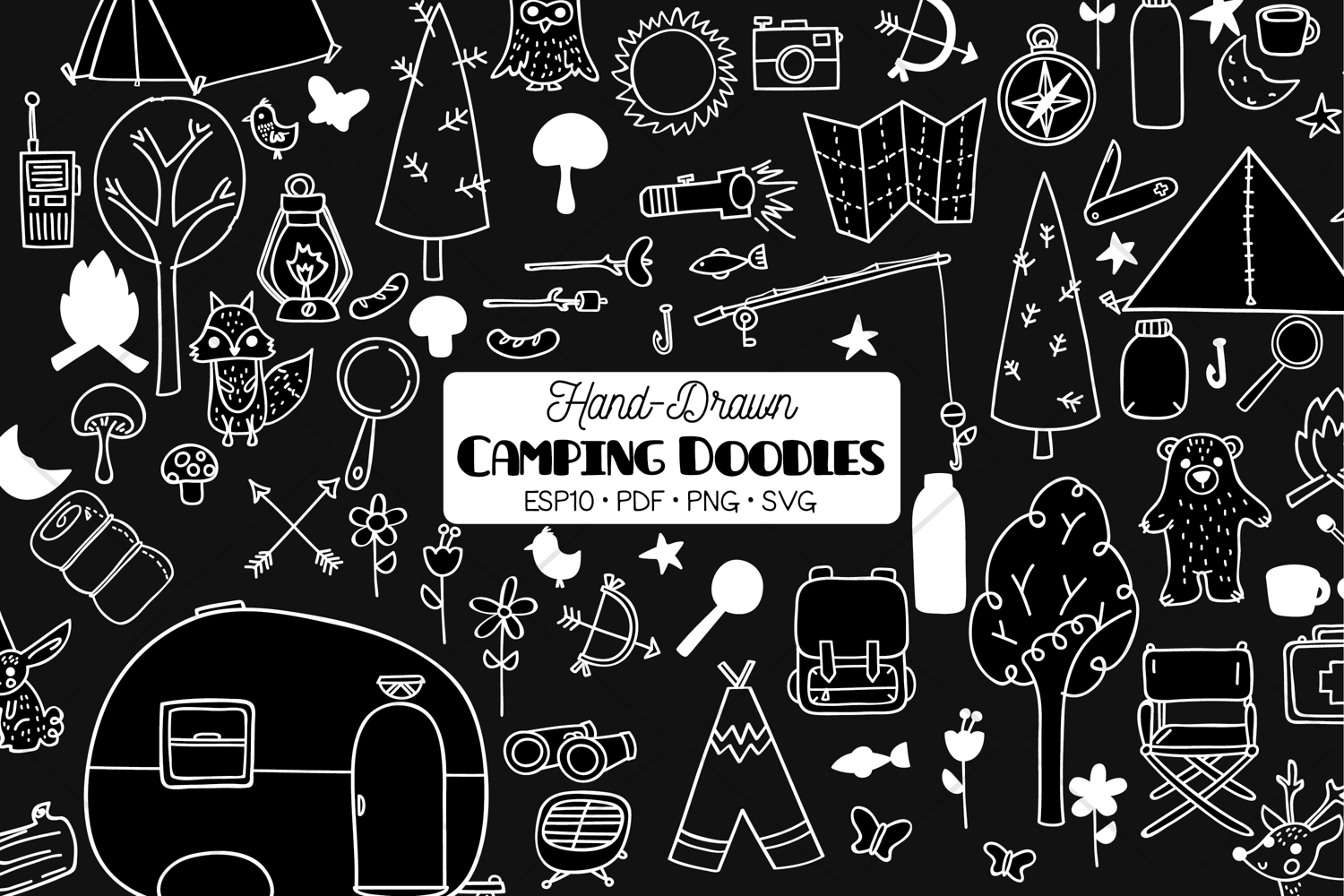 A set of hand-drawn camping doodles; vintage trailer, wood forest animals, outdoor activities, fishing hunting trip.