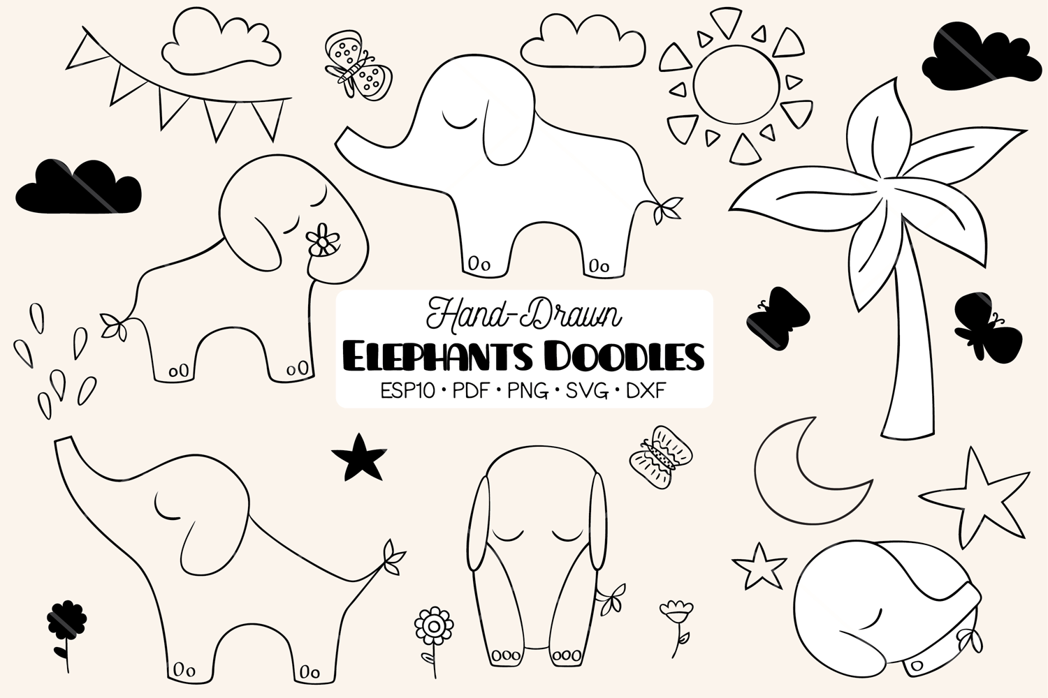 A set of hand-drawn baby elephants & nature elements; elephant, palm tree, flowers, moon, star, sun, banner, clouds.