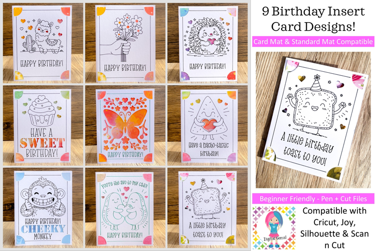 These nine gorgeous birthday insert card designs are perfect for making fun, unique handmade cards using your cutting machine. Featuring cute characters and playful birthday puns, they are ideal for friends, family, children and adults alike.