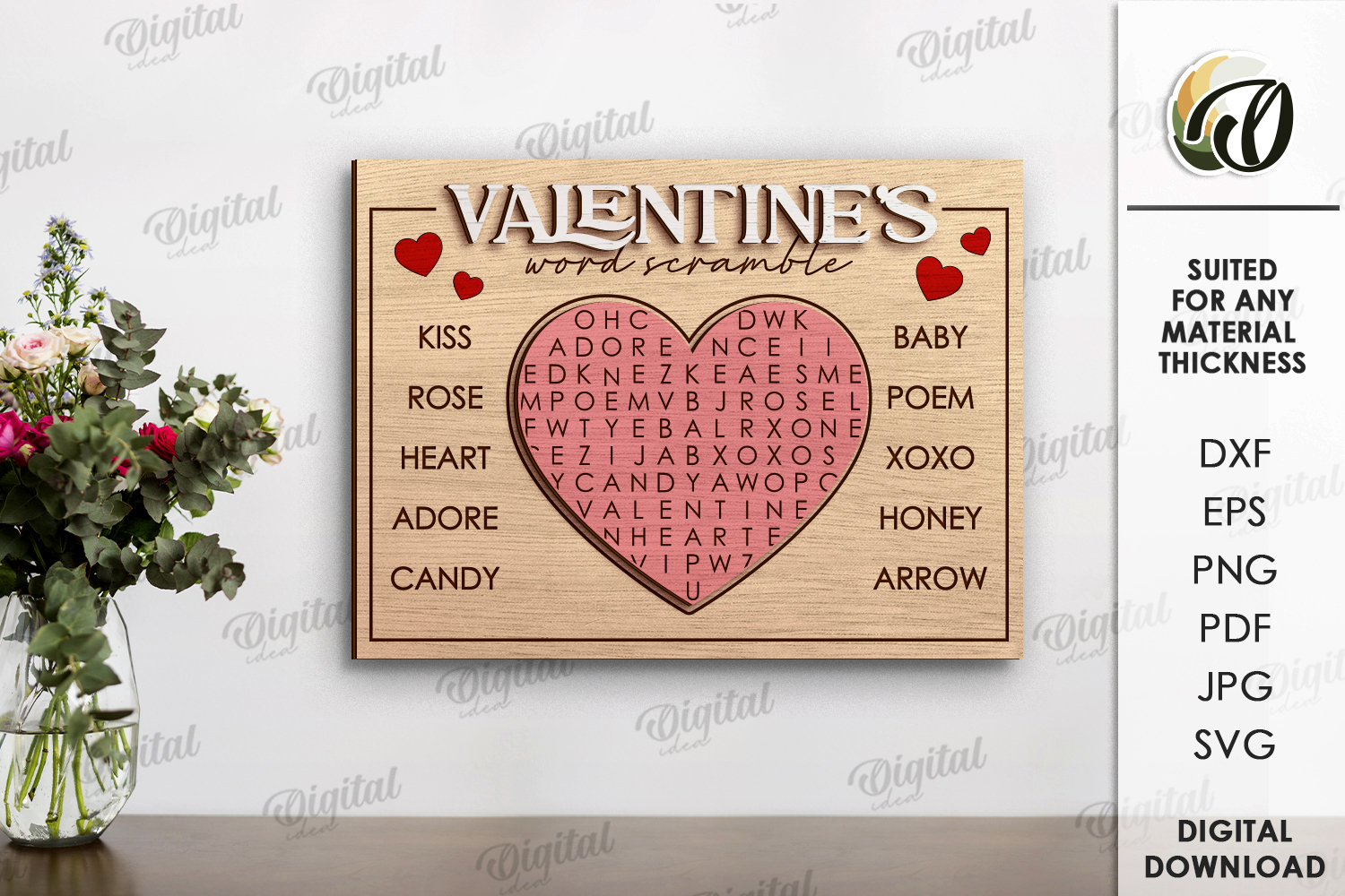 Valentine's Day Word Search Laser Cut. Wall Decor SVG
