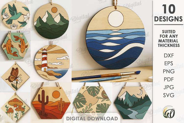 Your purchase will include zip folder with 10 designs in SVG, DXF, EPS, PDF, JPG and PNG file formats.