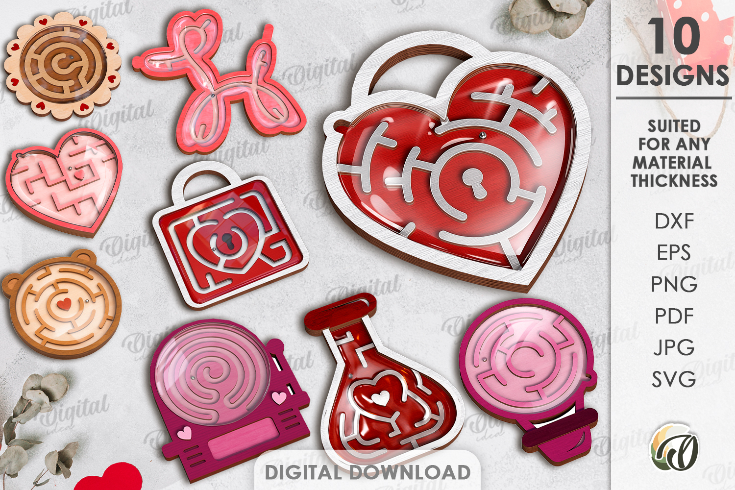 Valentine's Day Maze Bundle Laser Cut. Maze Game SVG