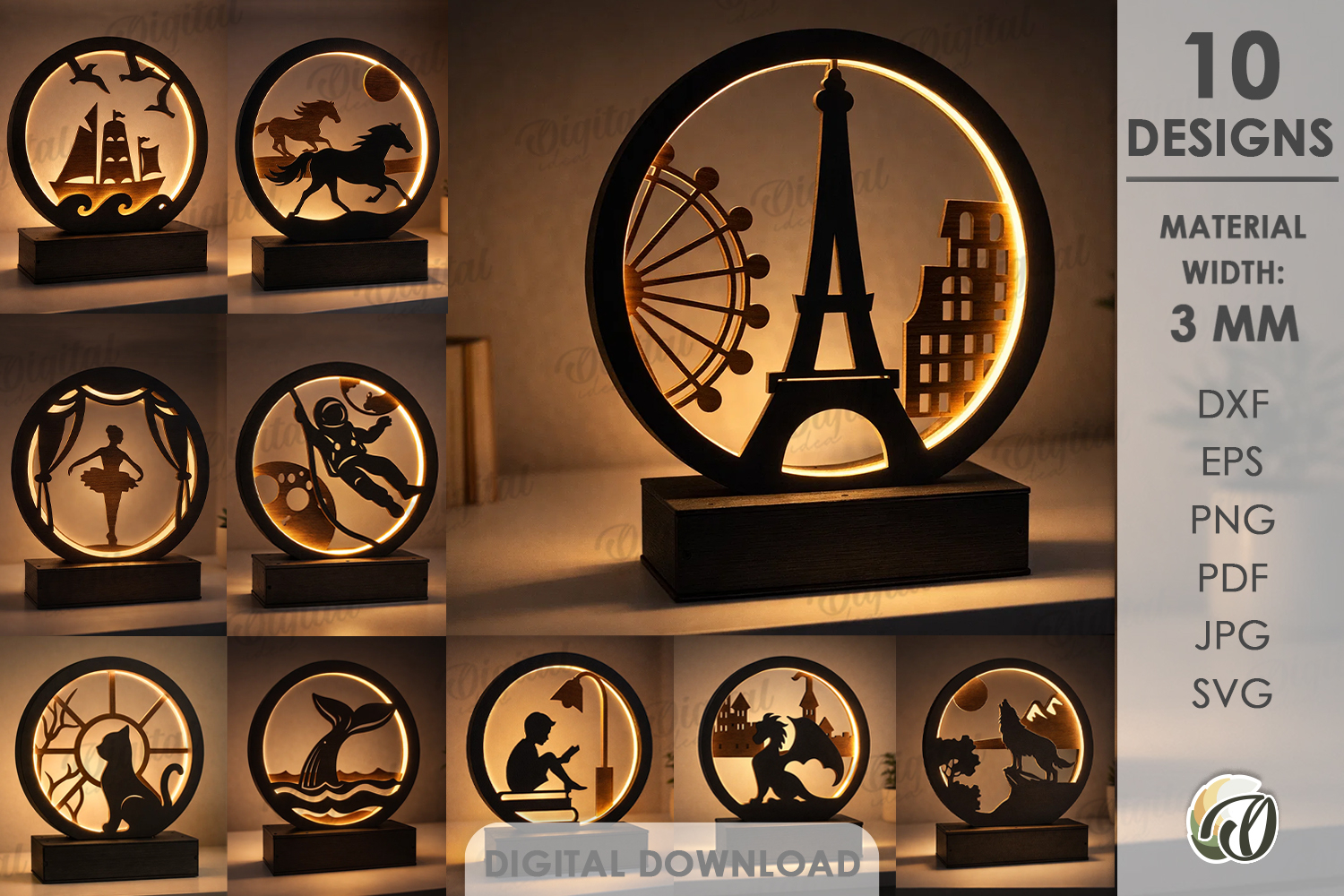 Your purchase will include zip folder with 10 designs in SVG, DXF, EPS, PDF, JPG and PNG file formats.