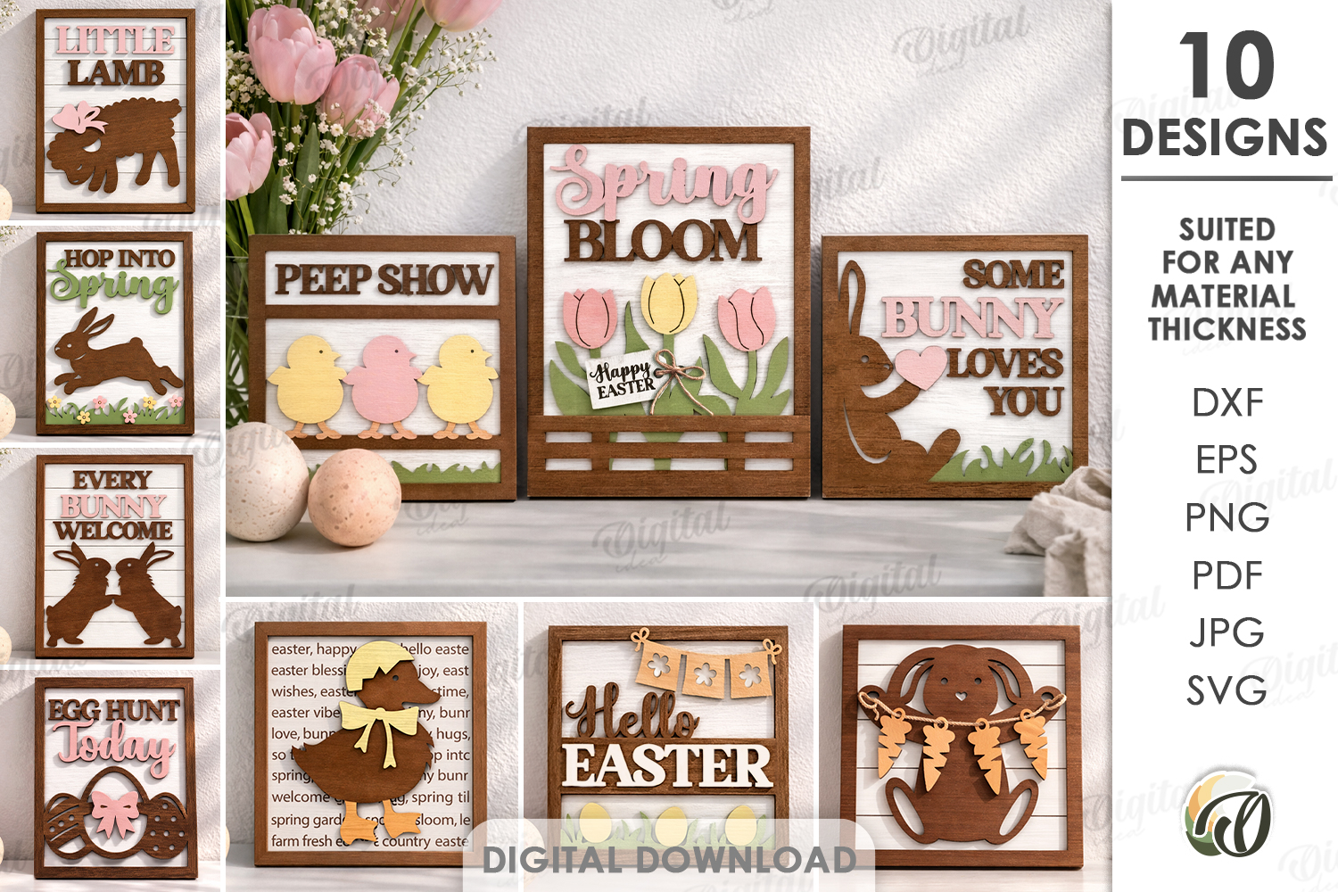 Your purchase will include zip folder with 10 designs in SVG, DXF, EPS, PDF, JPG and PNG file formats.