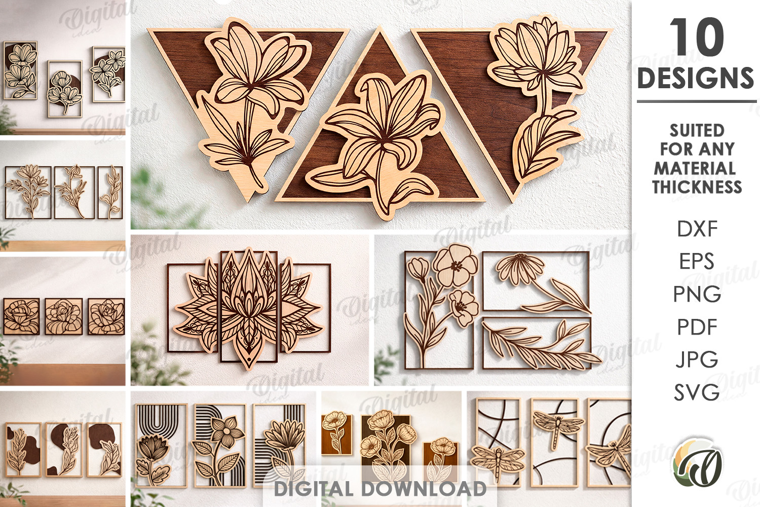 Your purchase will include zip folder with 10 designs in SVG, DXF, EPS, PDF, JPG and PNG file formats.