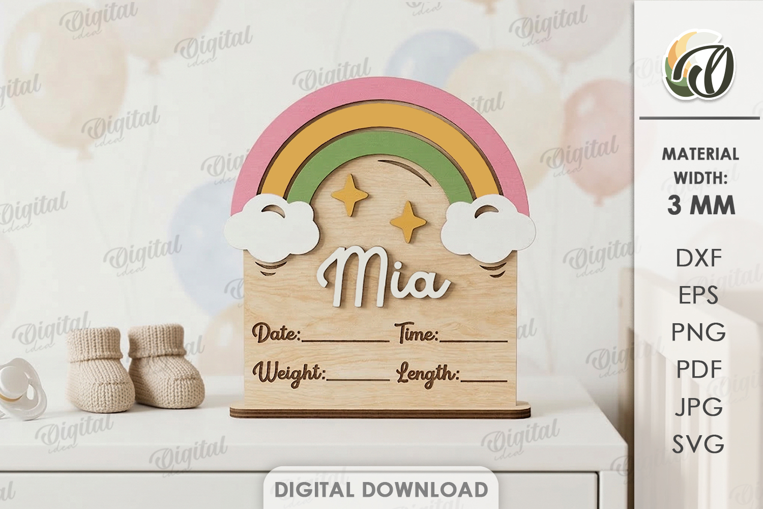 Personalized Rainbow Svg Newborn Birth Announcement Nursery Decor Name Sign Baby Birth Stats 3d Laser Cut Baby Laser Stand Laser