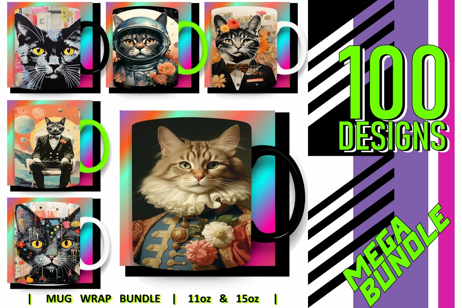 100 Cat Mug Wrao Bundle Sublimation PNG, 11oz 15 oz, Kitty