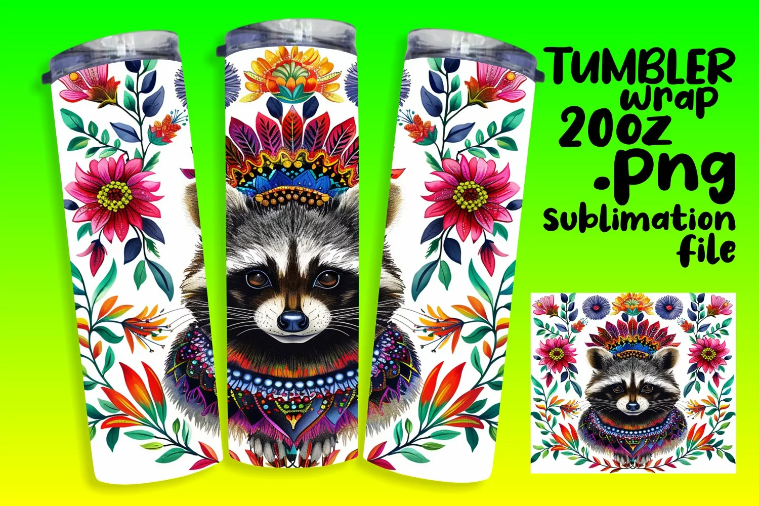 Floral Design Sublimation Design Straight Tumbler Skinny Tumbler Wrap Flower Wrap Tumbler Wrap 20oz Colorful Raccoon Vibrant Raccoon Raccoon Wrap Bright Raccoon
