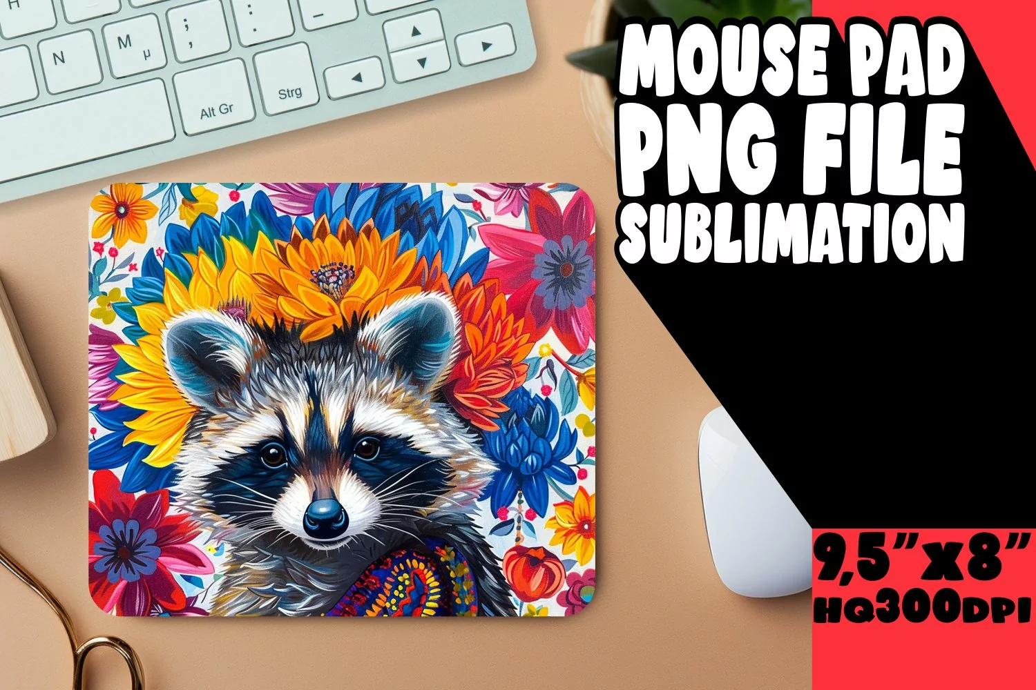 Sublimation Mouse Pad: Bright Raccoon with Flowers PNG